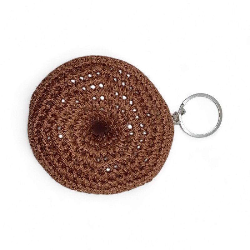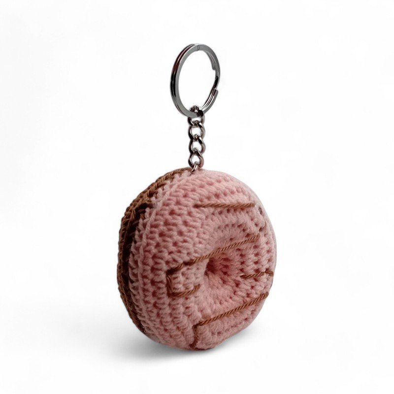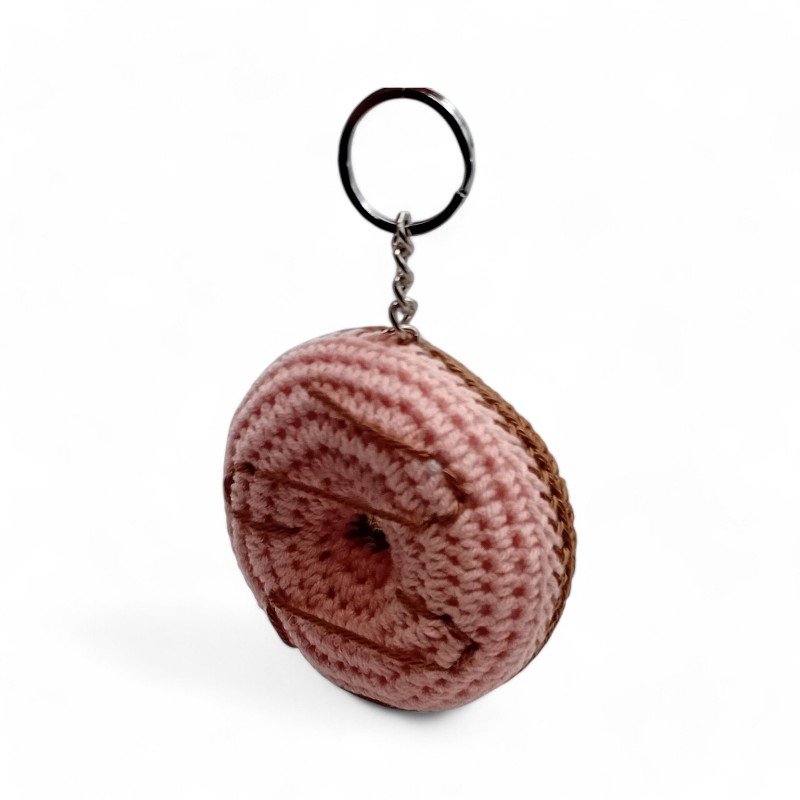 Μπρελόκ-Ντόνατ πλεγμένο με βελονάκι. Το σετ είναι κροσέ από λεπτό νήμα - βαμβάκι σε ροζ και καφέ χρώμα.