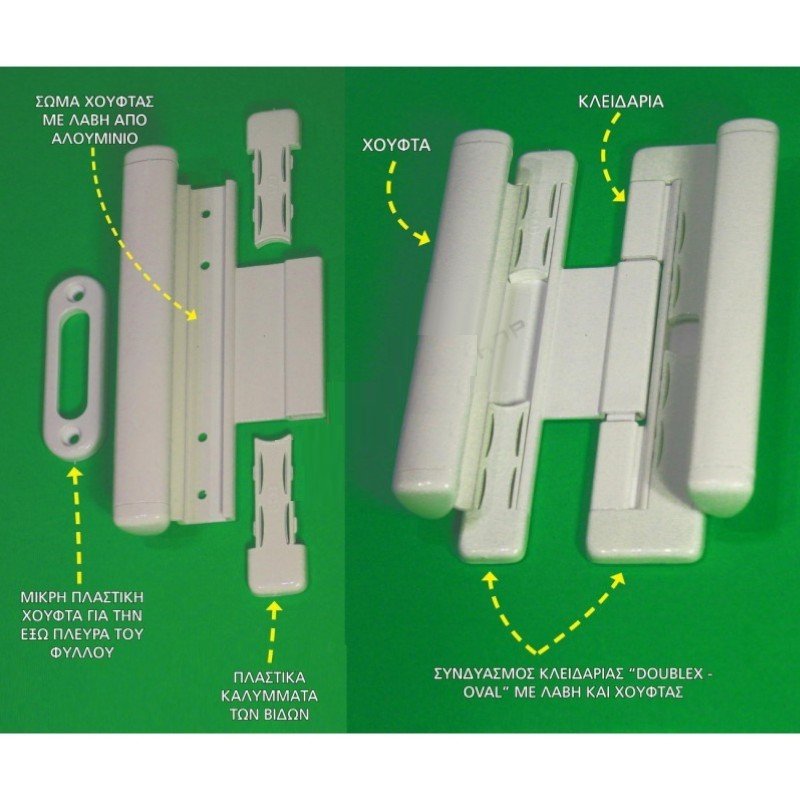 Δυνατή στην ασφάλεια καθώς 2 ατσάλινοι πίροι κουμπώνουν στο αντίκρυσμα ασφαλίζοντας 100% το χώρο σας. Τοποθετείται σαν πρώτη αλλά και σαν δεύτερη (πρόσθετη) κλειδαριά σε κάθε συρόμενο φύλλο. Έχει πάχος 6,5 mm. Παρέχει τη μέγιστη μηχανική ασφάλεια γιατί το κυπρί βιδώνεται με τέσσερεις βίδες που πιάνουν και την σιδερένια ψευτόκασα. Τοποθετείται πολύ εύκολα σε οποιοδήποτε ύψος. Έχει το πλεονέκτημα να φαίνεται από μακριά αν είναι ασφαλισμένη ή όχι Έχει περάσει τα αμερικανικά τεστ ασφαλειας με τη μεγαλύτερη επιτυχία και έχει απεδείχθει η ισχυρότερη κλειδαριά συρομένων από το 2002 Η συσκευασία CAL DOUBLEX OVAL περιλαμβάνει 1 τεμάχιο που αποτελείται από: (α) κυρίως σώμα με τους 2 χαλύβδινους πίρρους ασφαλείας, (β) πλαστικό κάλυμα, (γ) μικρή εξωτερική χούφτα, (δ) αντίκρυσμα που φωλιάζουν οι πίρροι και (ε) 2 πλαστικές προεκτάσεις-αποστάτες που φέρνουν το κυπρί-αντίκρυσμα πιο κοντά στη κλειδαριά σε πιο βαθιά προφίλ. Υπάρχουν διαφορετικές επιλογές για την κλειδαριά, ανάλογα που θέλετε να την τοποθετήσετε. Αν ασφαλίζει δεξιά ή αριστερά τότε επιλέγετε την απλή έκδοση. Αν τα κουφώματα ασφαλίζουν στο κέντρο (φιλητά συρόμενα) θα χρειαστείτε επιπλέον την χούφτα. Αν η πόρτα είναι βαριά και ανοίγει δύσκολα, μπορείτε να προσθέσετε το χερούλι-λαβή όπου κουμπώνει βιδωτά πάνω στην κλειδαριά Doublex Oval