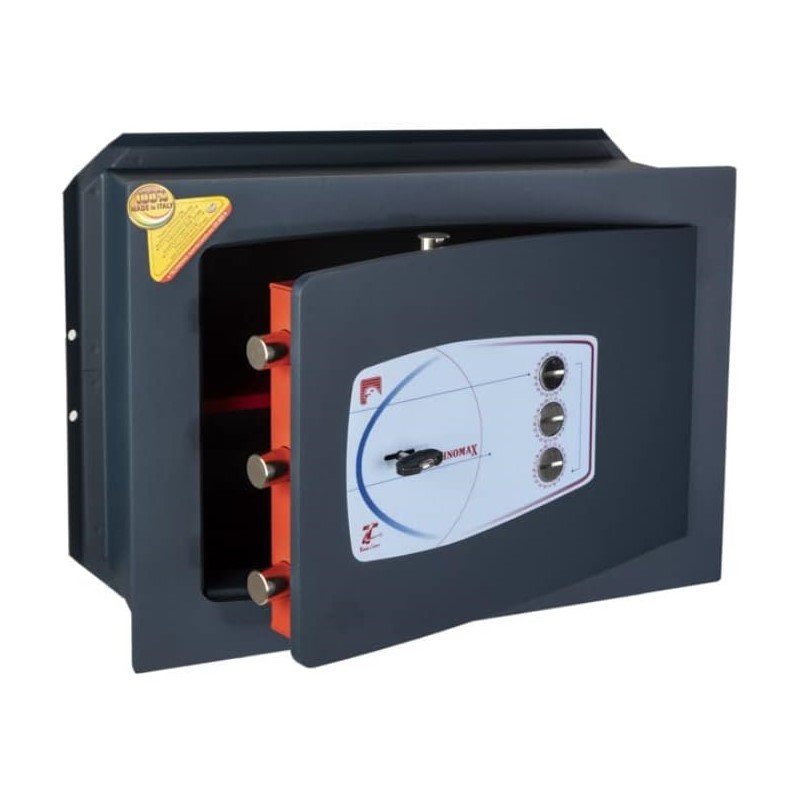 Χρηματοκιβώτιο τοίχου Technomax από τη σειρά "Gold Diplo" μοντέλο GD/5. Κλειδαριά ασφαλείας τελευταίας γενιάς, με 8 ασύμμετρους και ανεξάρτητους μοχλούς, με πιστοποίηση UNI EN 1300. Βασίζεται στη χρήση νέων μοχλών με μεγάλη αντοχή. Δίπλευρο κλειδί με ειδικό προφίλ, που μπορεί να βγει με κάρτα ιδιοκτησίας για την αποφυγή μη εξουσιοδοτημένης αντιγραφής των κλειδιών. 3 μοχλοί συνδυασμού με 20 θέσεις ο καθένας. Το να τραβήξετε το κλειδί όταν έχουν γυρίσει οι κλειδαριές είναι αδύνατο. Κλειδαριές από επινικελωμένο ατσάλι, περιστρεφόμενες, Ø 22 mm, προστασία του μηχανισμού κλειδώματος με πλάκα από χάλυβα μαγγανίου. Ειδικοί μεντεσέδες πόρτας για εξαιρετική αντοχή σε απόπειρες διάρρηξης. Ανθεκτικές εσωτερικές ραφές συγκολλημένες στο σώμα, φτιαγμένες με σύστημα ρομπότ. Ένθετο ράφι εσωτερικά.