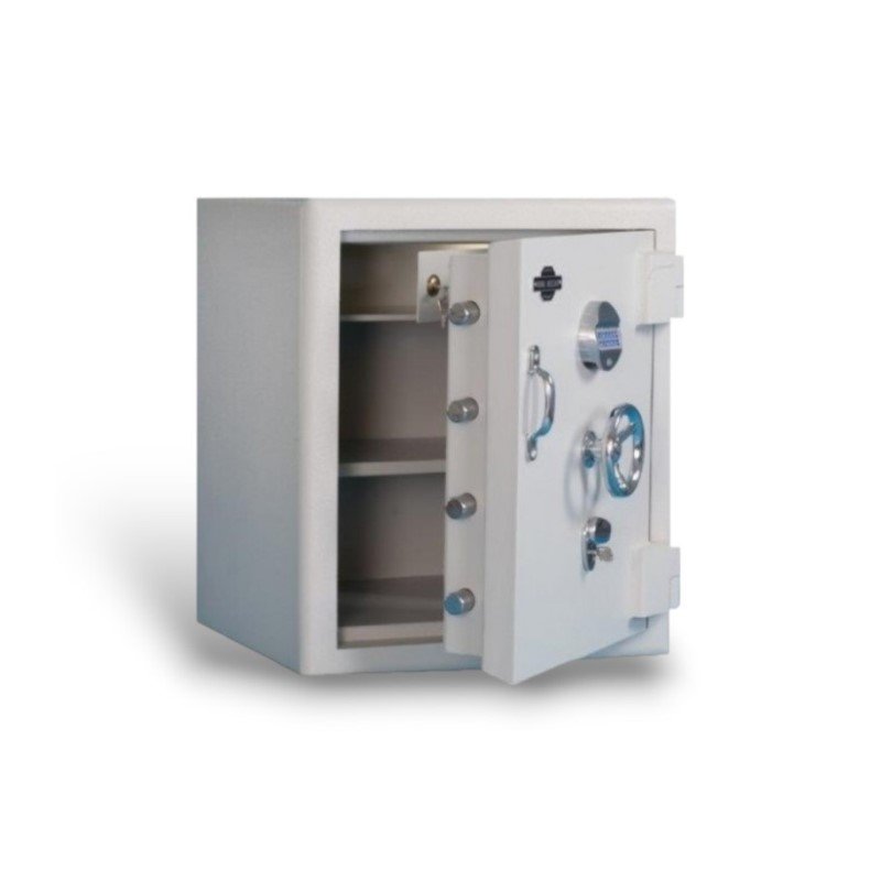 Ασφάλιση: Hλεκτρονικός κλειδάριθμος πληκτρολογίου του οίκου TECHNOLOCK MOD 2050 με οπτικοηχητικές ενδείξεις χρόνου αναμονής - επιστροφής, με παράθυρο ανοίγματος (ΟPENING WINDOW) με οπτικοηχητική ένδειξη πτώσης τάσεως μπαταριών (LOW BATTERY), με δυνατότητα χρήσης από 1-9 χρήστες (USERS), και 1 προϊστάμενο (SUPERVISOR), με μέγιστη δυνατότητα χρόνου 1-99 min, πιστοποιημένος σύμφωνα με τα EUROPEAN NORMS EN 1300, από τον VDS CLASS B (RESISTANCE GRADE). Το χρηματοκιβώτιο θα φέρει επίσης και μία μηχανική κλειδαριά ασφαλείας του Οίκου MAUER