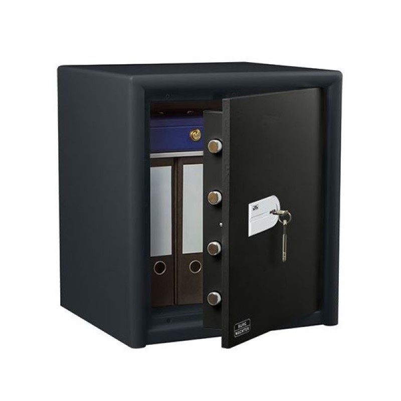 Ανεξάρτητα από το μέγεθος ή το σύστημα κλειδώματος: όλα τα χρηματοκιβώτια Dual-Safe είναι εξοπλισμένα με πιστοποιημένη πυροπροστασία (αντίσταση στη φωτιά LFS 30P σύμφωνα με το DIN 15659). Αυτό σημαίνει ότι σε περίπτωση πυρκαγιάς, το εσωτερικό περιεχόμενο του χρηματοκιβωτίου προστατεύεται για τουλάχιστον 30 λεπτά. Έχει κατασκευαστεί από ειδικό υλικό πυροπροστασίας σύμφωνα με το DIN 4102 και καλύπτεται από ειδική σύνθετη μόνωση μπροστά από την πόρτα που χρησιμεύει ως θερμομόνωση. Αυτό προστατεύει τον μηχανισμό κλειδώματος και μπουλονιού από υπερβολική θερμότητα. Χάρη στο επίπεδο ασφάλειας Β, η ασφαλής σειρά Dual-Safe προσφέρει ασφαλιστική προστασία έως 20.000 ευρώ (ιδιωτική) και 2.500 ευρώ (εμπορική).