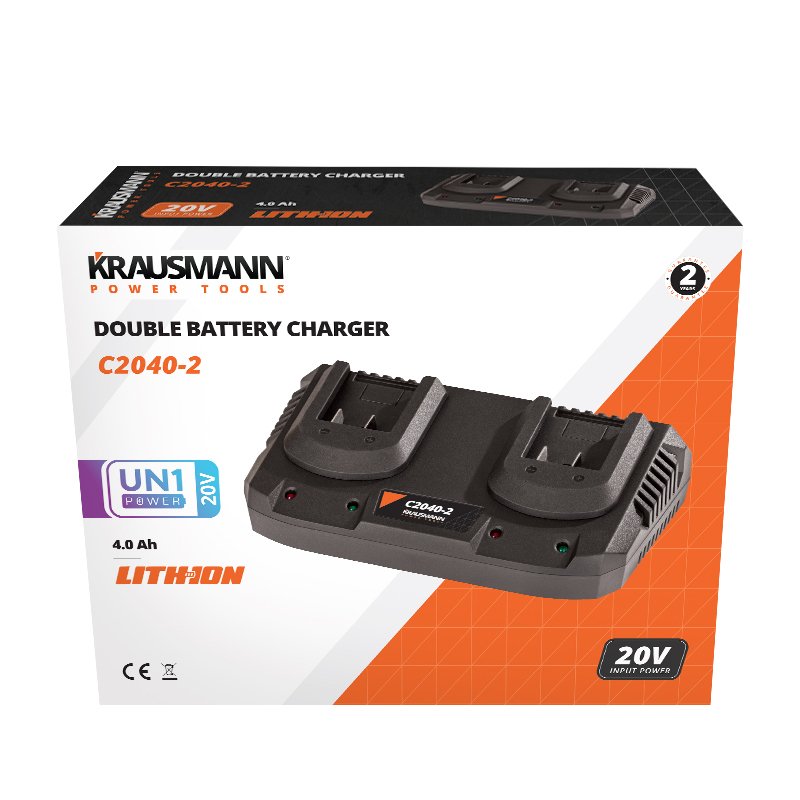 Φορτιστής KRAUSMANN® για μπαταρίες τύπου UN1 POWER Li-Ion 20V. Διαγνωστικό με ένδειξη λυχνίας LED που δείχνει την κατάσταση της μπαταρίας.