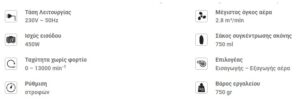 • Ταχύτητα χωρίς φορτίο 0 – 13000 rpm