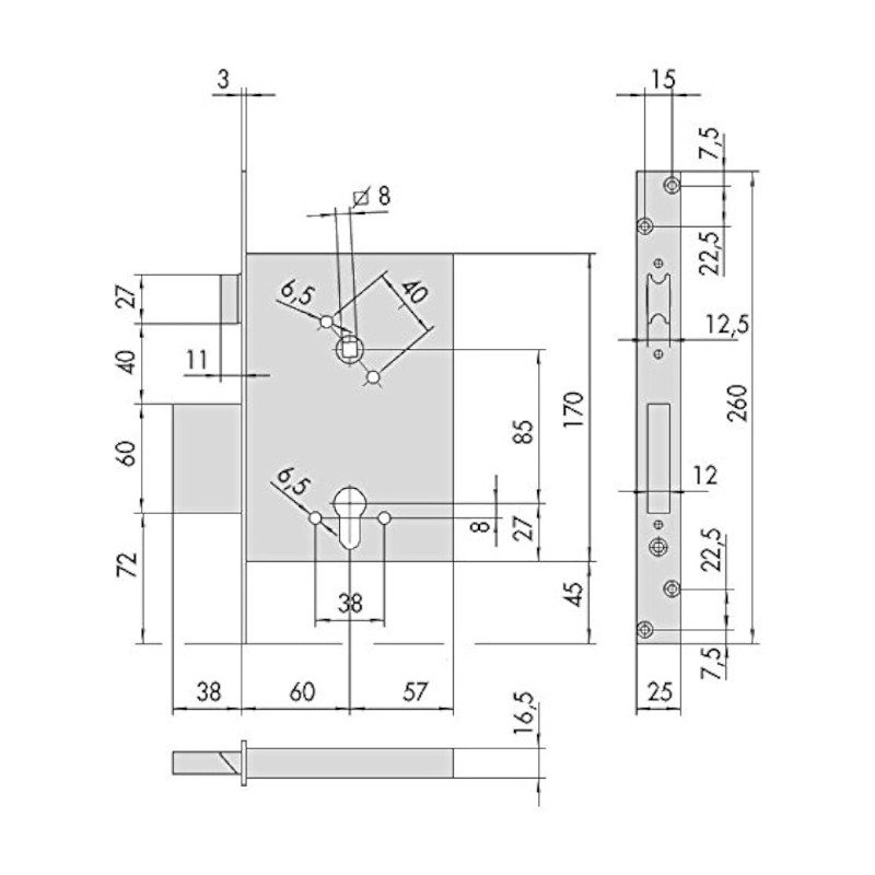 Κλειδαριά κυλίνδρου με μονοκόμματη γλώσσα και πόμολο, κέντρο 60mm, αντικαθιστά την 57250. (Σκέτη χωρίς κύλινδρο)