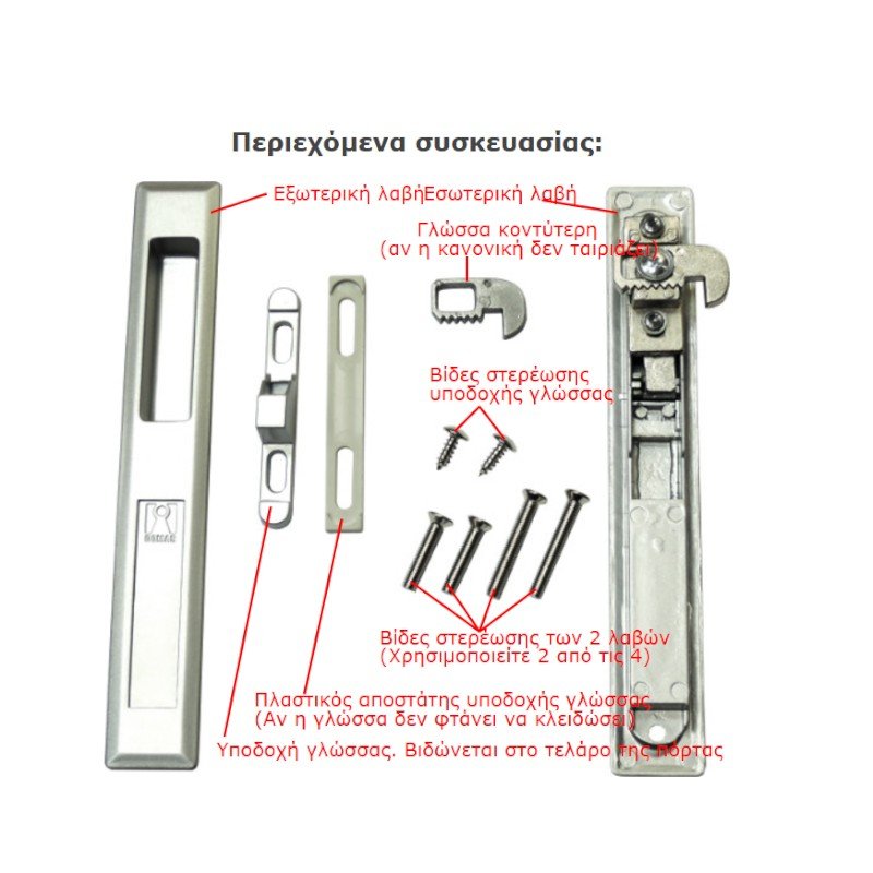 βίδες και δύο γλώσσες κλειδώματος (μακριά και κοντή).