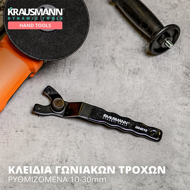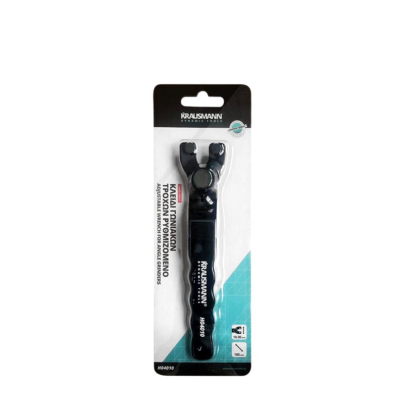 Το ρυθμιζόμενο κλειδί γωνιακών τροχών KRAUSMANN® είναι ιδανικό για βίδωμα παξιμαδιών σύσφιξης δίσκων γωνιακών τροχών. Είναι ελαφρύ, ανθεκτικό και εύχρηστο, προσαρμόζεται σε όλους τους γωνιακούς τροχούς ανεξαρτήτως μάρκας ή διάστασης και είναι ειδικά σχεδιασμένος για να παρέχει κλείδωμα λαβής ανεξαρτήτως της φοράς περιστροφής. Έχει μήκος 185mm και η ρυθμιζόμενη απόσταση ανάμεσα στις δύο ακίδες του είναι από 10mm έως 30mm.