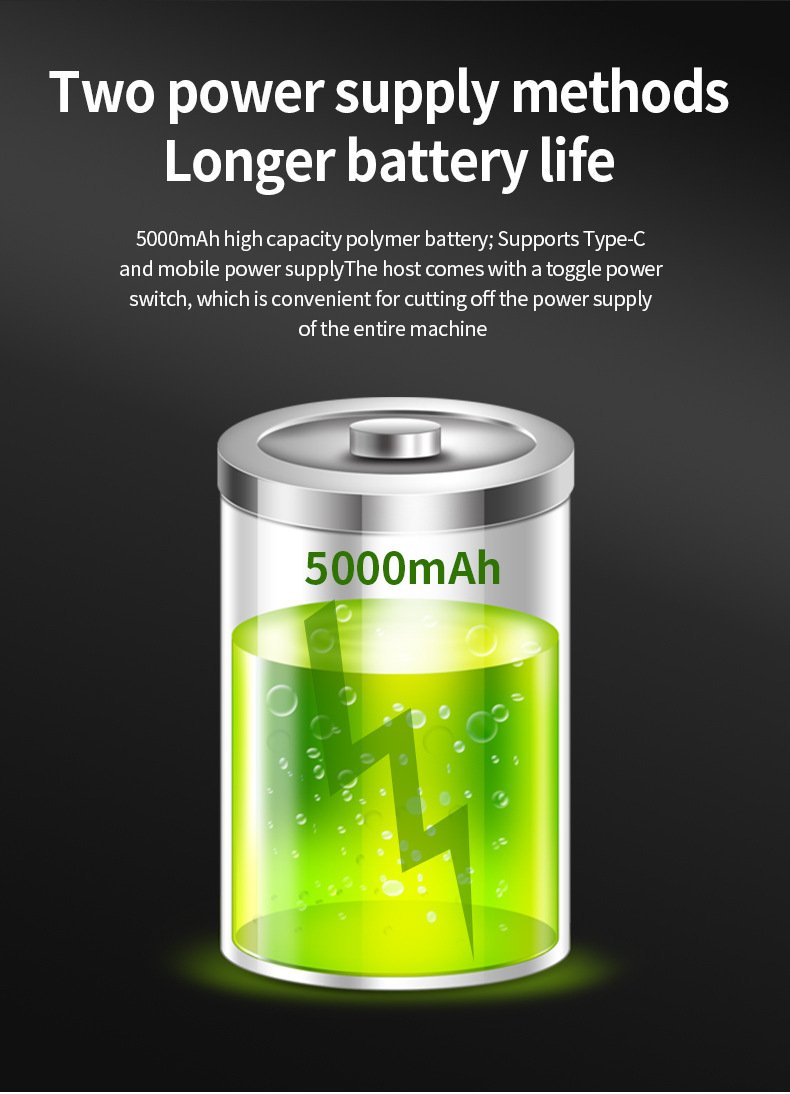- Επαναφορτιζόμενη Μπαταρία: Τροφοδοτείται από ισχυρή επαναφορτιζόμενη μπαταρία 5000mAh, προσφέροντας μεγάλη αυτονομία.