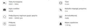 • Ρυθμιζόμενη ταχύτητα χωρίς φορτίο 3000 – 30000 rpm