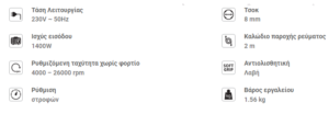 • Ρυθμιζόμενη ταχύτητα χωρίς φορτίο 4000 – 26000 rpm