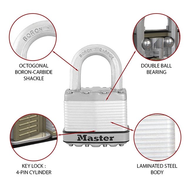 • Με σώμα απο επεξεργασμένο λαμινέ ατσάλι για αντοχή στις καιρικές συνθήκες. • Με Tough-CutTM οκτάγωνο λαιμό από καρβίδιο του βορίου, είναι 50% πιο σκληρός από ατσάλι. • Με διπλό κλείδωμα με ρουλεμάν. • Διατίθεται με 4 κλειδιά.