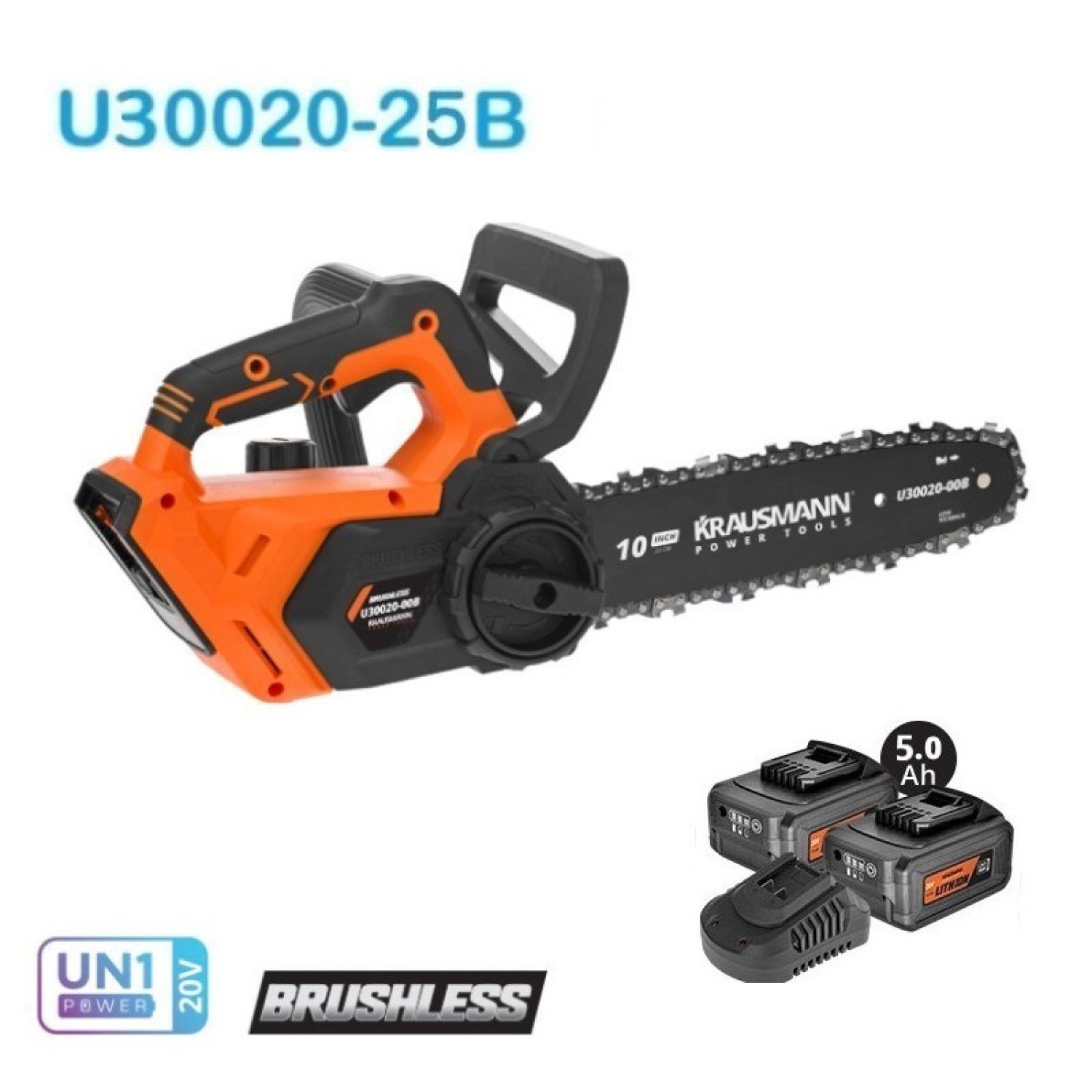 Σετ Αλυσοπρίονο BL 205mm Επαναφορτιζόμενο 20V Krausmann + 2 x Μπαταρία 5.0Ah + Ταχυφορτιστή + Τσάντα μεταφοράς (U30020-25B)