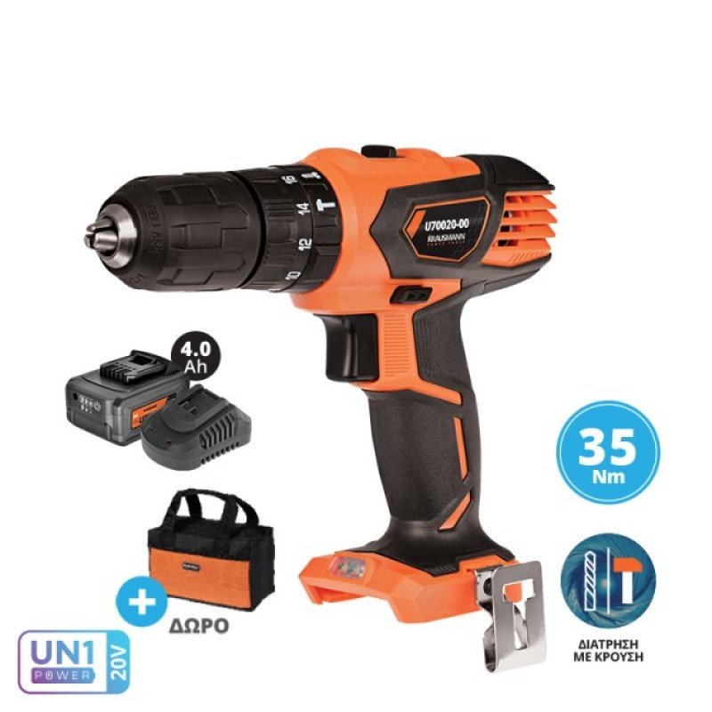 Σετ Δραπανοκατσάβιδο Κρουστικό Επαναφορτιζόμενο 20V Krausmann +Μπαταρία 4.0Ah + Ταχυφορτιστή + Τσαντα μεταφοράς (U70020-14S)