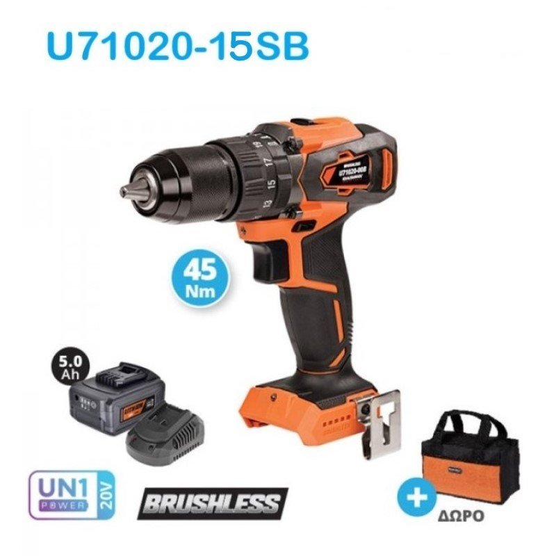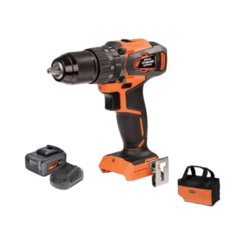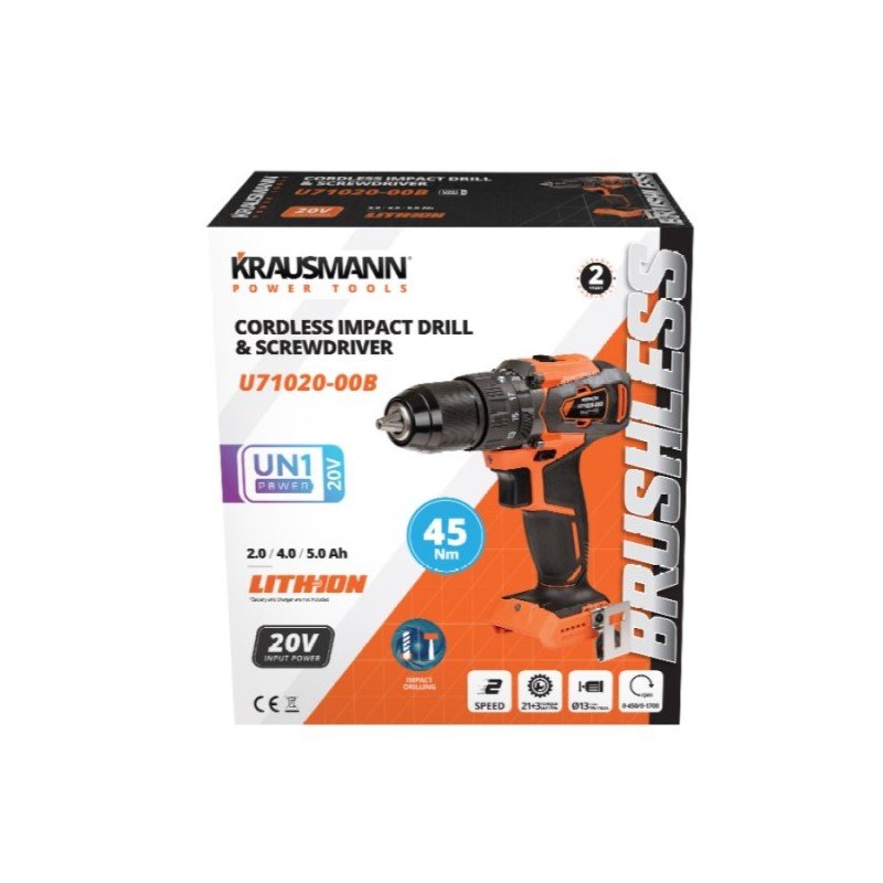 20V Δραπανοκατσάβιδο κρουστικό επαναφορτιζόμενο KRAUSMANN® U71020-00B 45Nm, ιδανικό για διάτρηση σε ξύλο, μέταλλο ή παρόμοια υλικά, και περιστασιακά για διάτρηση με κρούση σε τοιχοποιία ή δομικά υλικά. Το LED εργασίας διαθέτει αισθητήρα φωτός για εξοικονόμηση μπαταρίας σε συνθήκες ημέρας.