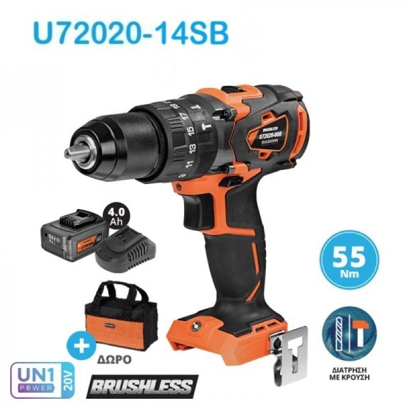 20V Δραπανοκατσάβιδο κρουστικό επαναφορτιζόμενο KRAUSMANN® U72020-14B 55Nm, ιδανικό για διάτρηση σε ξύλο, μέταλλο ή παρόμοια υλικά, και περιστασιακά για διάτρηση με κρούση σε τοιχοποιία ή δομικά υλικά. Το LED εργασίας διαθέτει αισθητήρα φωτός για εξοικονόμηση μπαταρίας σε συνθήκες ημέρας.