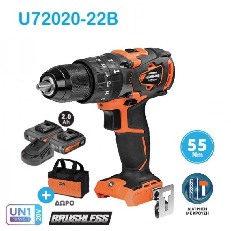 20V Δραπανοκατσάβιδο κρουστικό επαναφορτιζόμενο KRAUSMANN® U72020-22B 55Nm, ιδανικό για διάτρηση σε ξύλο, μέταλλο ή παρόμοια υλικά, και περιστασιακά για διάτρηση με κρούση σε τοιχοποιία ή δομικά υλικά. Το LED εργασίας διαθέτει αισθητήρα φωτός για εξοικονόμηση μπαταρίας σε συνθήκες ημέρας.