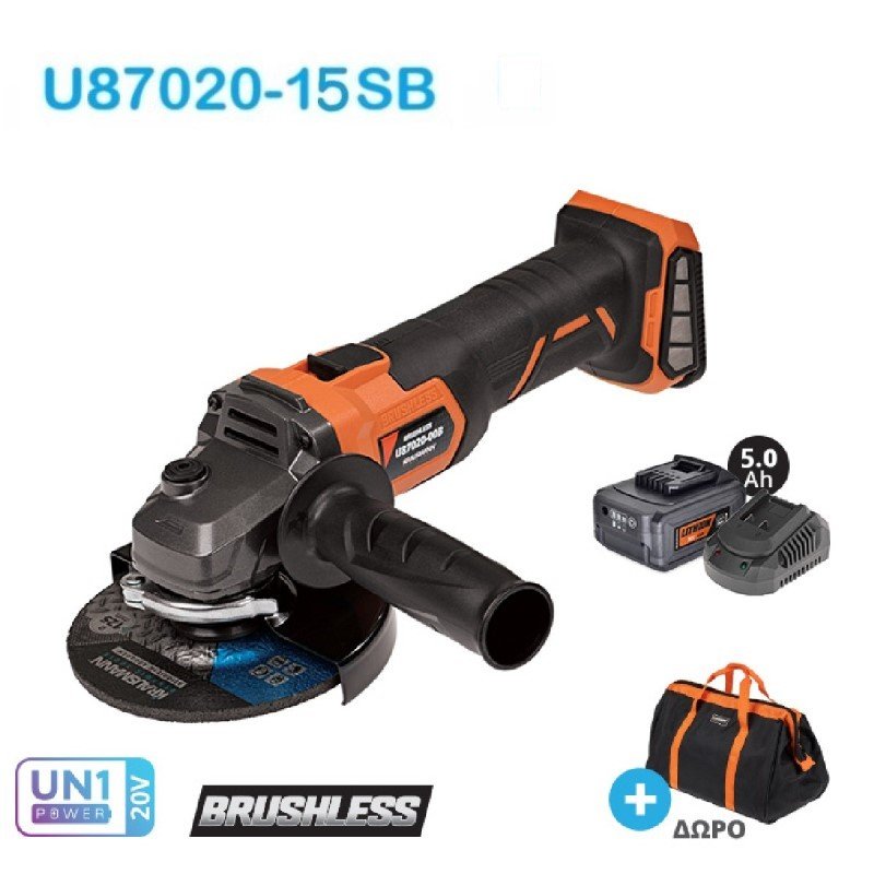 Σετ Γωνιακός Τροχός Ø125 Επαναφορτιζόμενο 20V BL Krausmann +Μπαταρία 5.0Ah + Ταχυφορτιστή + Τσάντα μεταφοράς (U87020-15SΒ)
