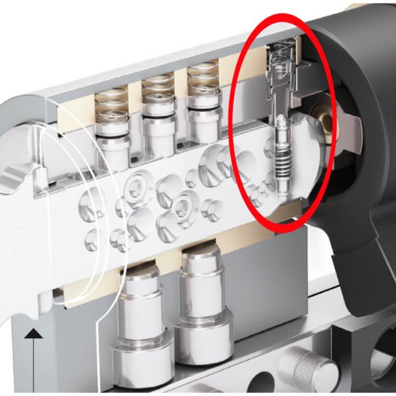• Με 16 pin και 2 παλινδρομικά κρυμμένα σφαιρίδια στο τερματισμό του κλειδιού για απόλυτη προστασία σε διάρρηξη και αντιγραφή κλειδιών.