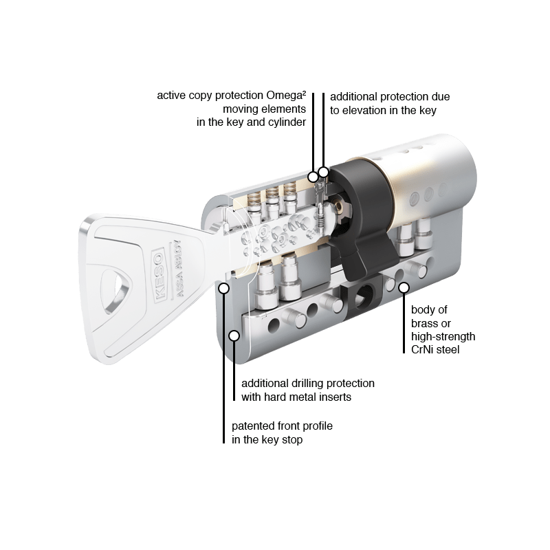 • Ο κύλινδρος KESO 8000S OMEGA ξεχωρίζει από τα υπάρχοντα συστήματα άλλων κυλίνδρων επειδή η συνεχής μετατόπιση των γραμμών διάρρηξης και τα πολλά βάθη τον καθιστούν αδιάρρηκτο σε όλους τους μεθόδους διάρρηξης.