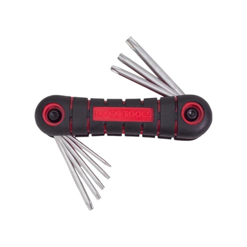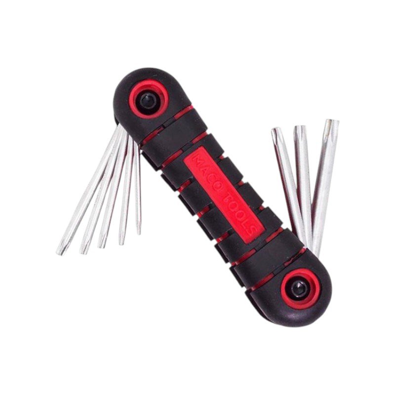 Σουγιάς με κλειδιά torx της εταιρείας Maco. To βασικό πλεονέκτημα του συστήματος torx είναι ότι ενώ ασκείτε λιγότερη δύναμη κατά το βίδωμα, τα κουμπώματα (τα μέρη που βιδώνετε) είναι πιο σφιχτά και επομένως πιο ασφαλή. Διατίθεται σε θήκη τύπου σουγιά που επιτρέπει την αναδίπλωση για την αποθήκευση των κλειδιών, αλλά και την ευκολότερη εύρεση του μεγέθους που απαιτείται για την εργασία.