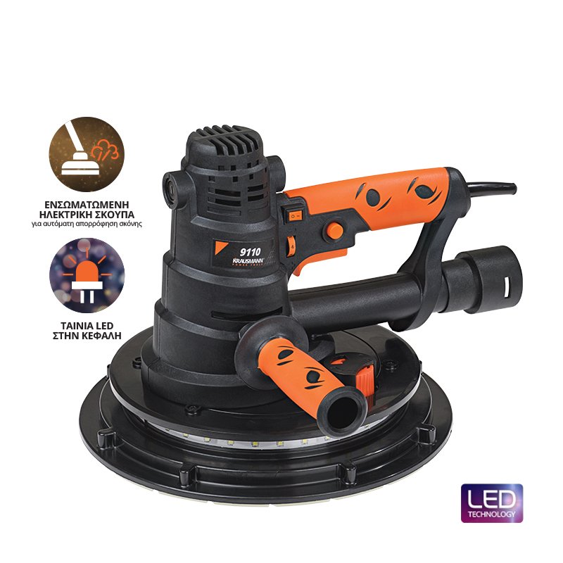Τριβείο τοίχου χειρός υψηλής ισχύος 800W με ενσωματωμένη ηλεκτρική σκούπα και ταινία LED διπλής σειράς στην κεφαλή. Διαθέτει μεταβλητή ταχύτητα χωρίς φορτίο 550-2050 rpm για ομαλό φινίρισμα. Η σύγχρονη καινοτομία χωρίς βουρτσάκι προσφέρει τέλειο και γρήγορο αποτέλεσμα χωρίς γραμμές, με ελάχιστο κόπο, αποφεύγοντας τη δημιουργία κοιλωμάτων στις επιφάνειες εργασίας.